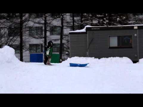 He asked mommy to put her back pack on to the toboggan. And toboggan slides down with the back pack. Haha