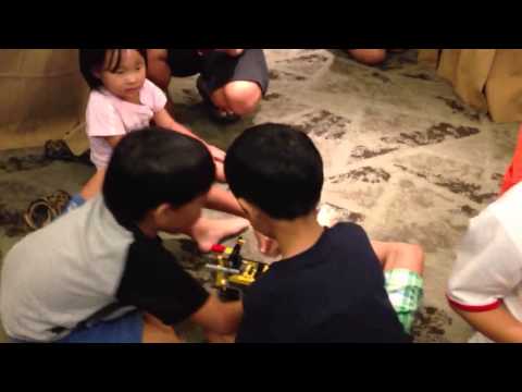 Ok. Battle begins. And unfortunately, it ended with a small drama. :). But it's ok la. They are still young. Just remember they are still kids, and that's how kids behave. Most importantly, how daddy and mommy do the damage control during such situation. Haha. So what I did is I pull Mr. Jay aside, and in front of him, I fixed up his robot, distract him by teaching him how to build a stronger robot. And then when it is done, lets battle again. Of course to prevent Mr. Jay to sop sop again, keep reminding him it's just a competition and its fine to lose. And he is back in the robot fight. And this time he is up against his good friend, Conrad's and Kayden's robot. And no parts coming down but Jay Jay's robot. Run away outside the white line.