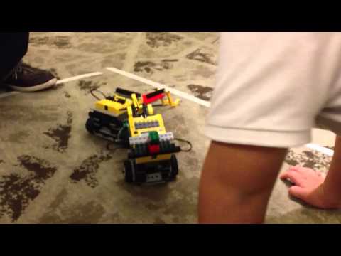It's a good thing we declare another round. Round 2 begins, and this time Jay's robot hung in there and Conrad's one dropped its arm. So Jay wins.